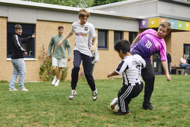Über einen ganz besonderen Besuch durften wir uns im Frühjahr 2025 freuen: Fußball-Weltstar Kai Havertz verbrachte kurzweilige Stunden in der Offenen Tür D-Hof mit gemeinsamem Essen, Quatschen, Fotos schießen, Fußball spielen und viel Lachen. Seine Antwort auf die Frage, ob er in der Schule gut gewesen sei: „Nein. Aber ich habe stets mein Bestes gegeben…